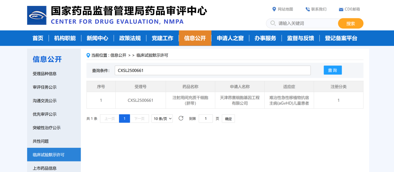 2025年11月3日, 天津昂賽細(xì)胞基因工程有限公司申報(bào)的注射用間充質(zhì)干細(xì)胞(臍帶)治療難治性急性移植物抗宿主病(aGvHD)兒童患者的適應(yīng)癥獲得國(guó)家藥品監(jiān)督管理局臨床試驗(yàn)?zāi)驹S可